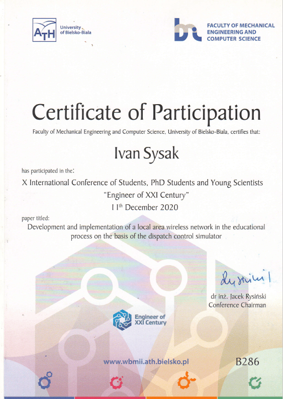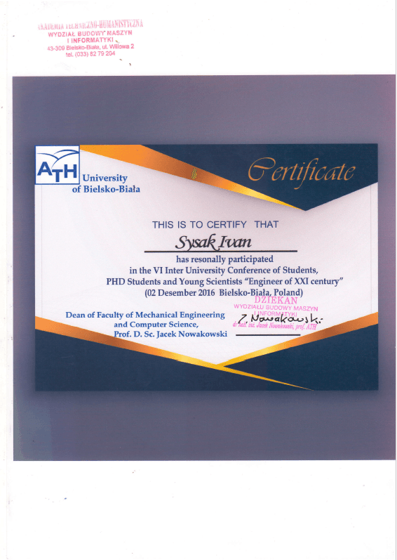- VI Inter University Conference of Students, PHD Students and Young Scientists «Engineer of XXI century» (02 December 2016 Bielsko-Biala, Poland)