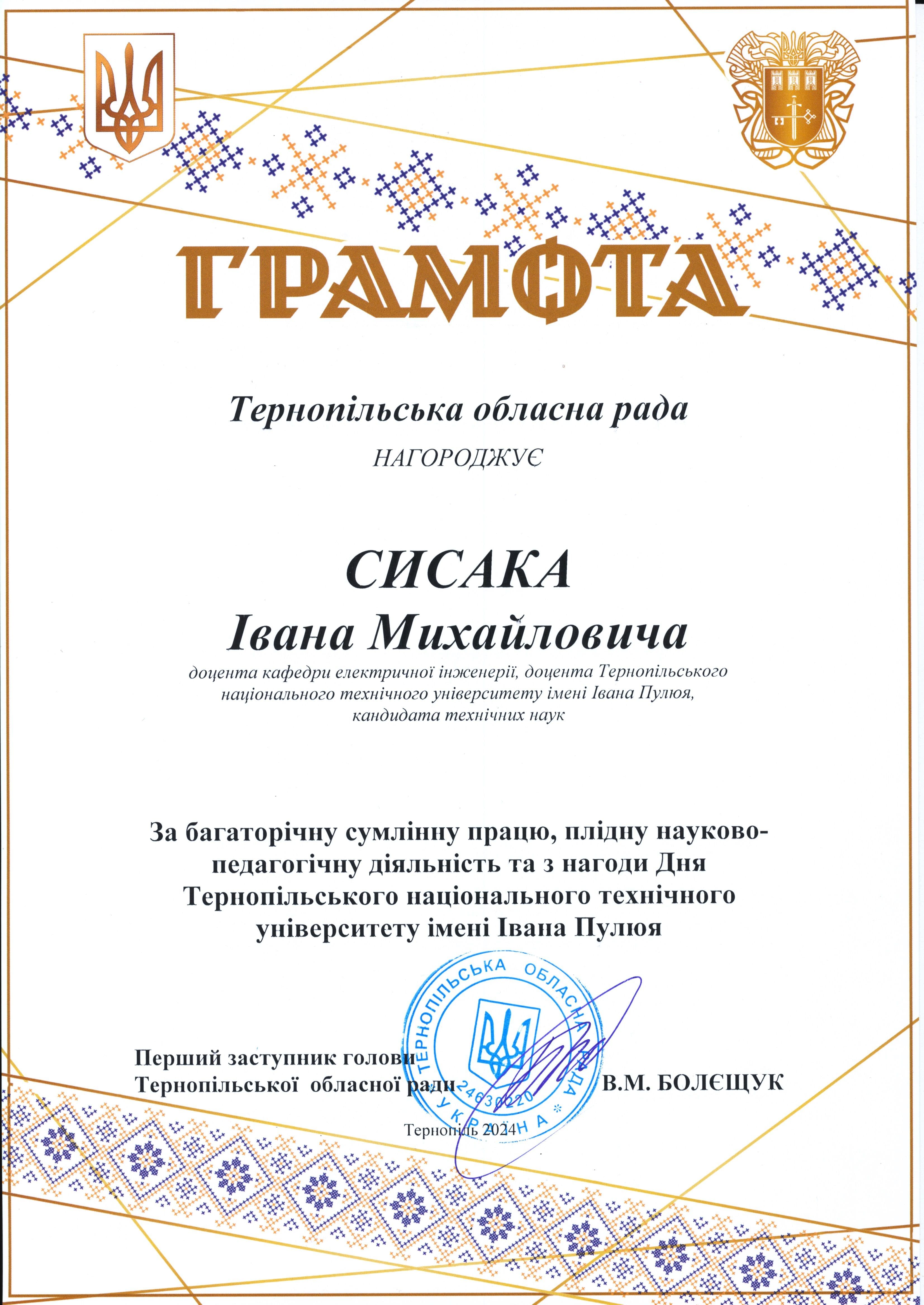 - Грамота Тернопільської обласної ради, травень 2024 р.
