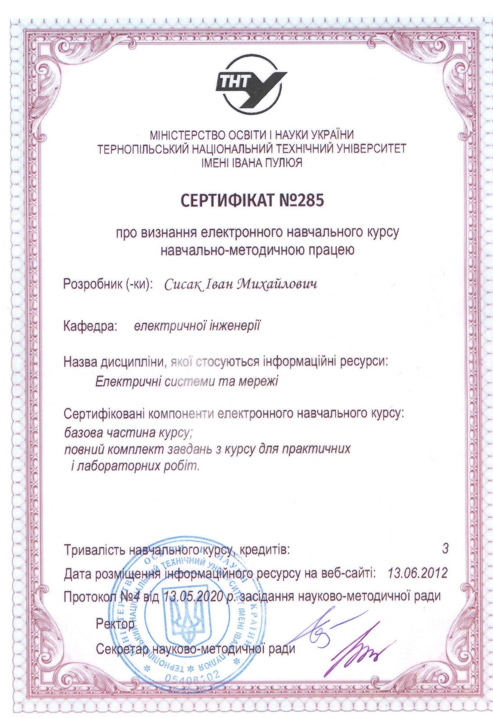 - Сертифікат № ДН 285 від 13.05.2020 р. про визнання інформаційних ресурсів навчально-методичною працею електронний навчальний курс «Електричні системи та мережі», виданий ТНТУ імені Івана Пулюя
