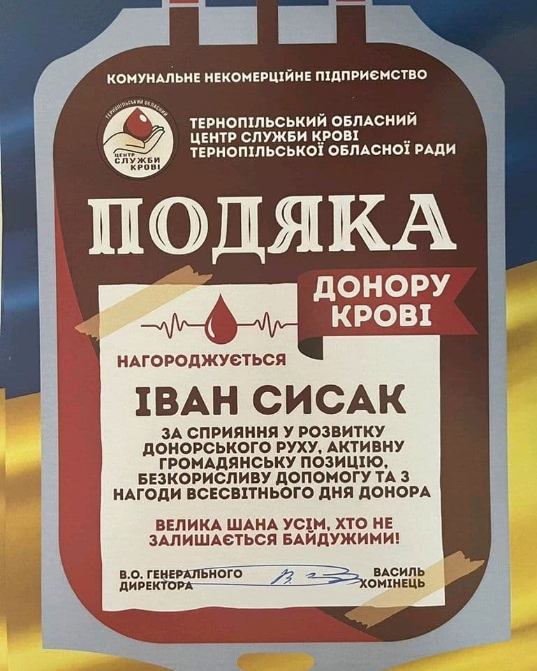 - Подяка донору крові від Комунального некомерційного підприємства "Тернопільський обласний центр служби крові Тернопільської обласної ради"