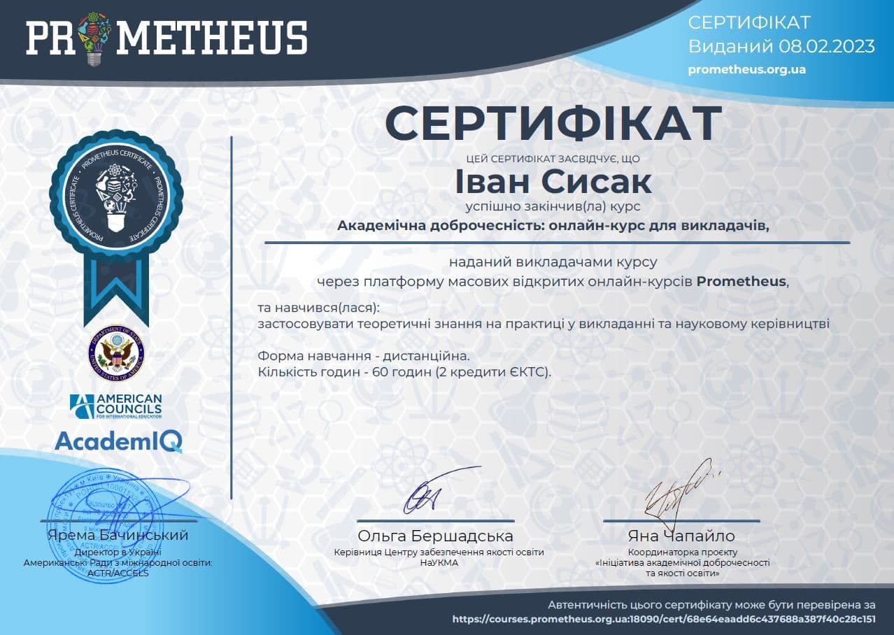 - "Сертифікат онлайн курсів PROMETHEUS для викладачів «Академічна доброчесність»" від 08.02.2023 р. обсягом 60 годин (2 кредити ЄКТС).