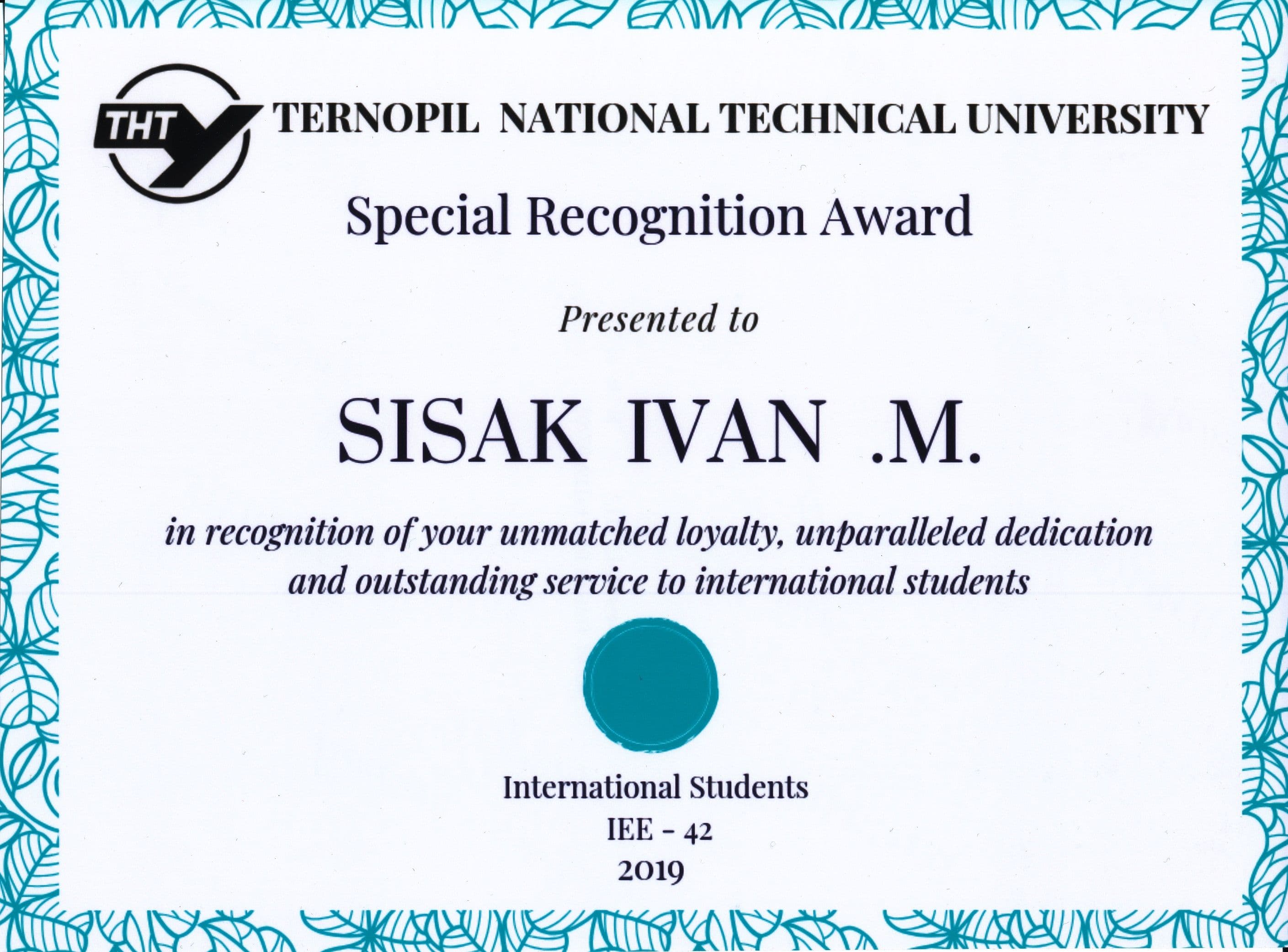 - Special Recognition Award from International Students, IEE-42, 2019 р.