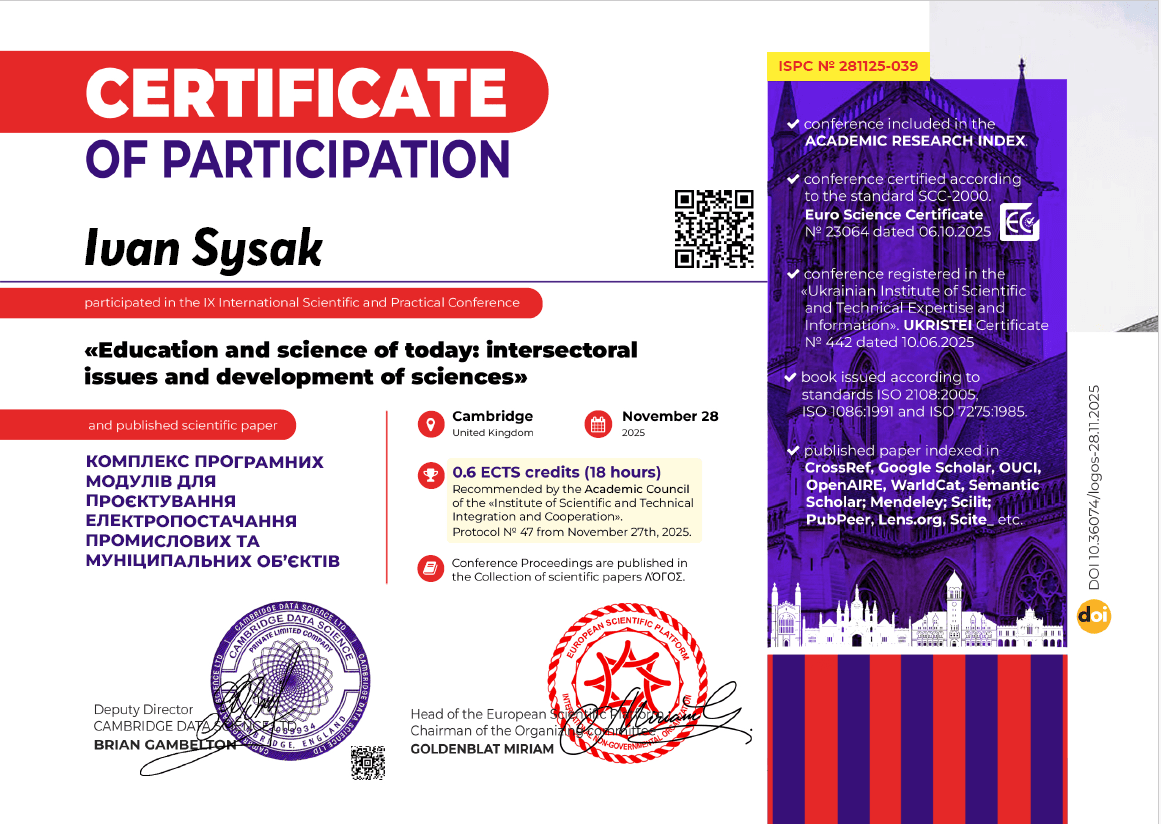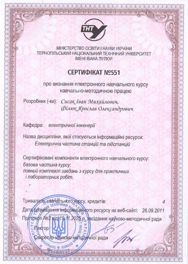 - Сертифікат № 551 від 19.11.2025 р. про визнання електронного навчального курсу «Електрична частина станцій та підстанцій»