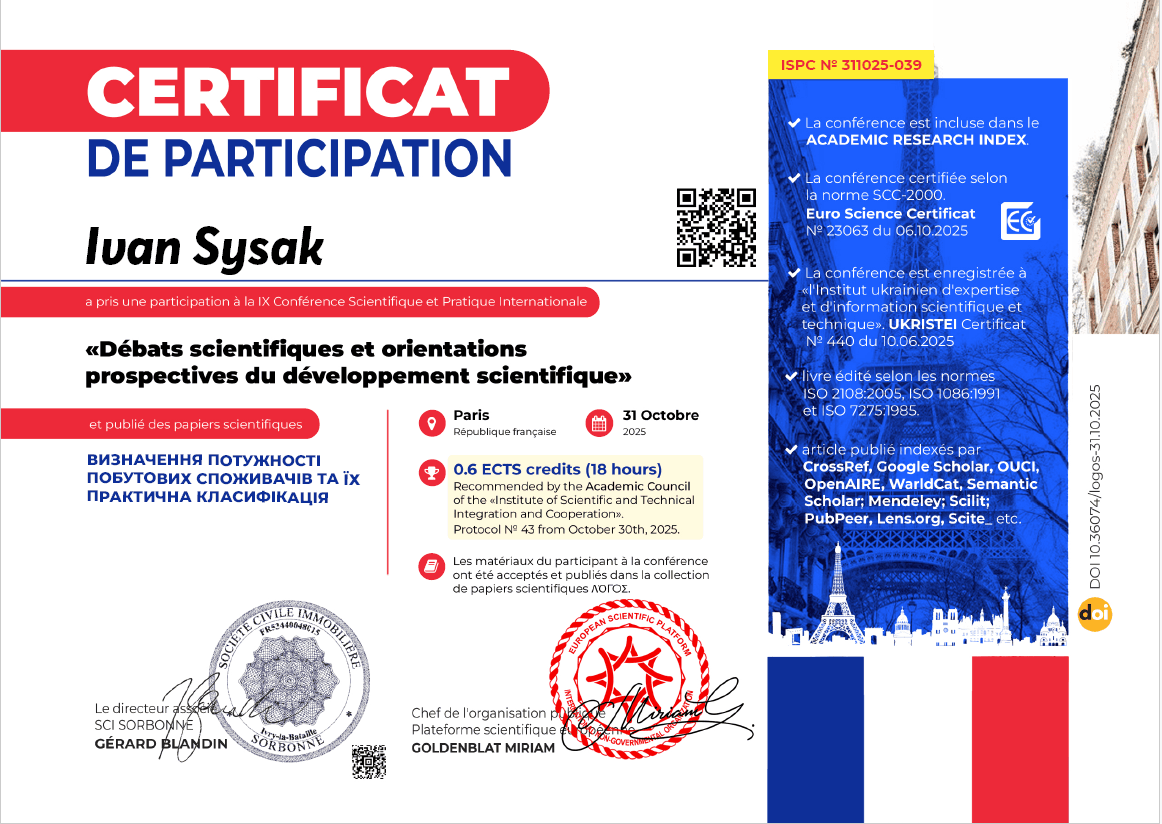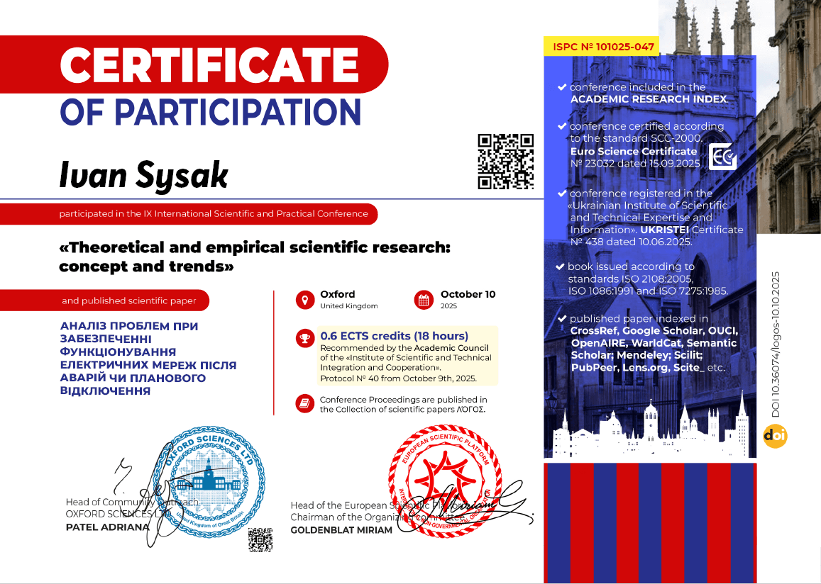 - Certificate of Participation. «Theoretical and empirical scientific research: concept and trends». Oxford, United Kingdom, October 10, 2025