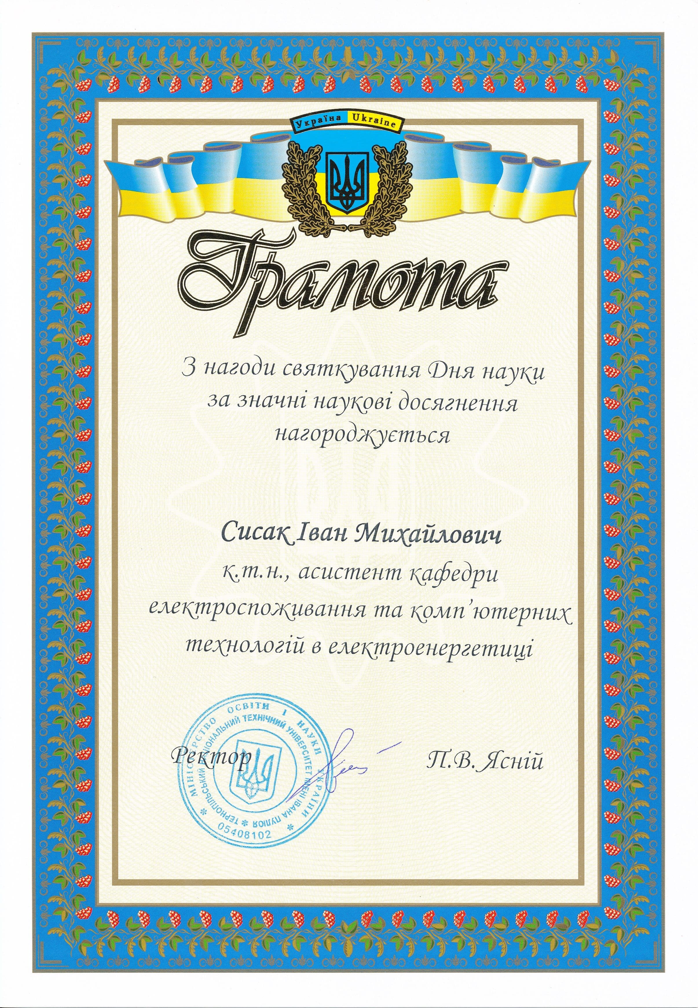 - Грамота "З нагоди святкування Дня науки за значні наукові досягнення"