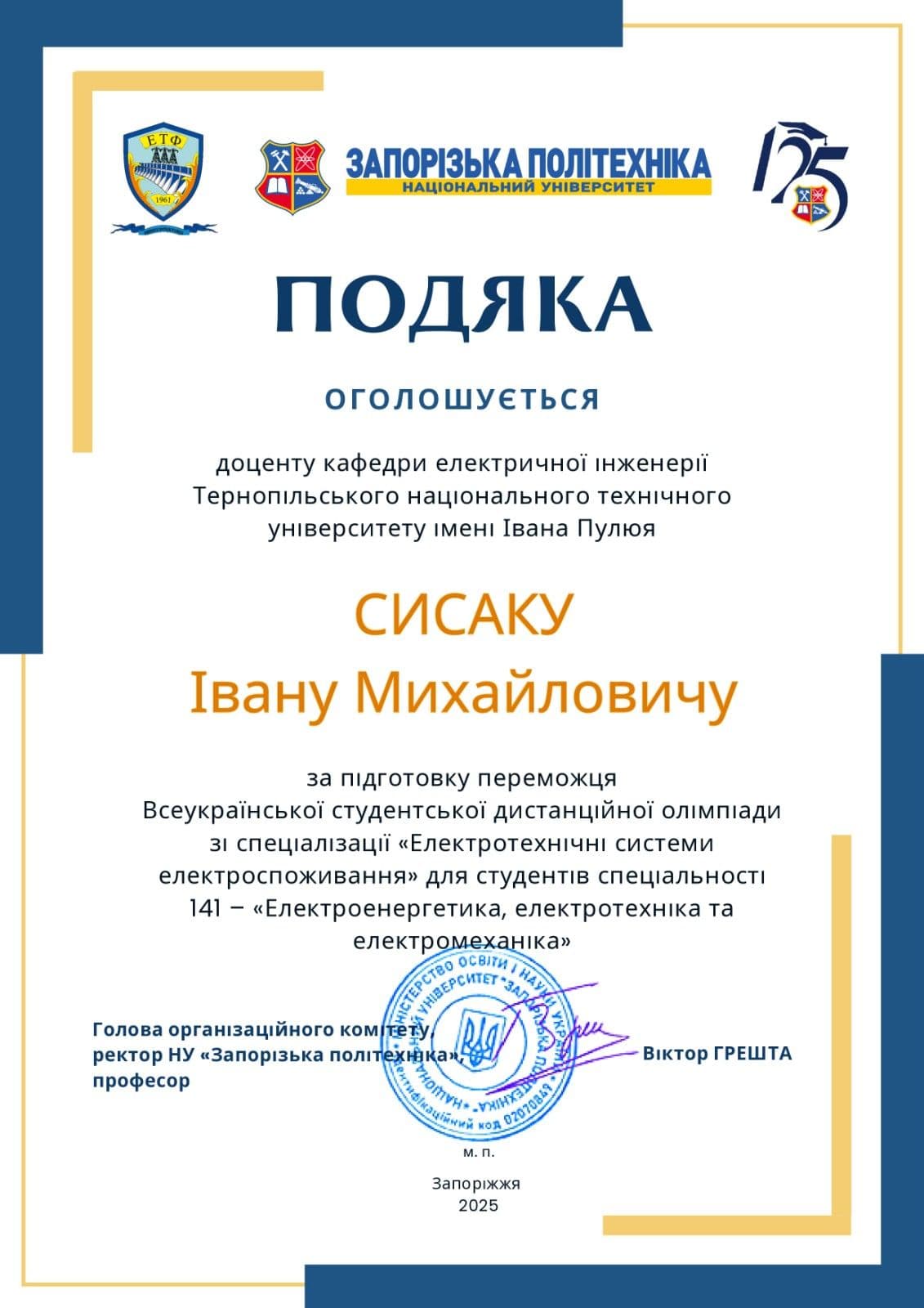 - Подяка за підготовку переможця Всеукраїнської студентської дистанційної олімпіади зі спеціалізації «Електротехнічні системи електроспоживання» для студентів спеціальності 141 – «Електроенергетика, електротехніка та електромеханіка», НУ «Запорізька політехніка», 2025.