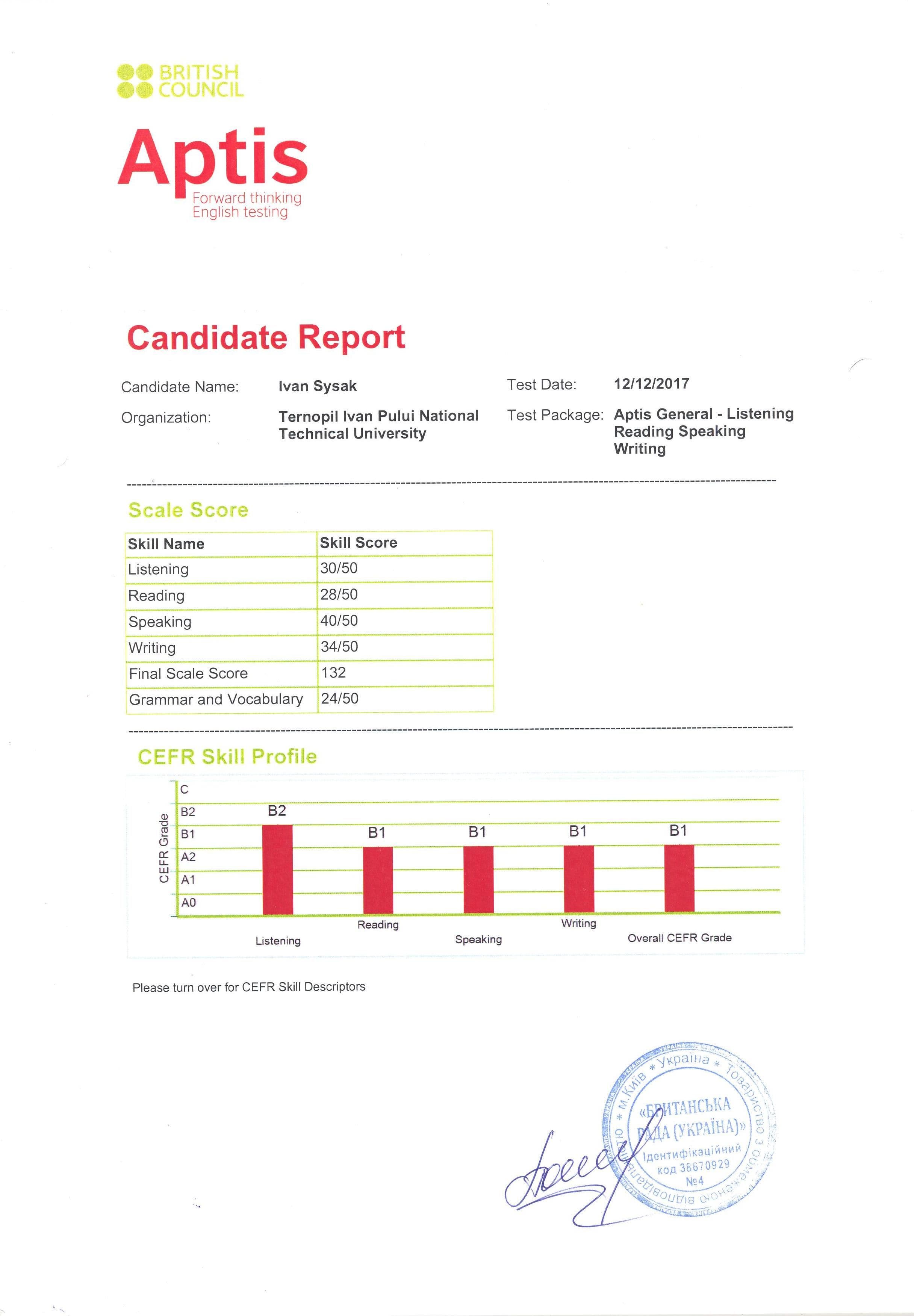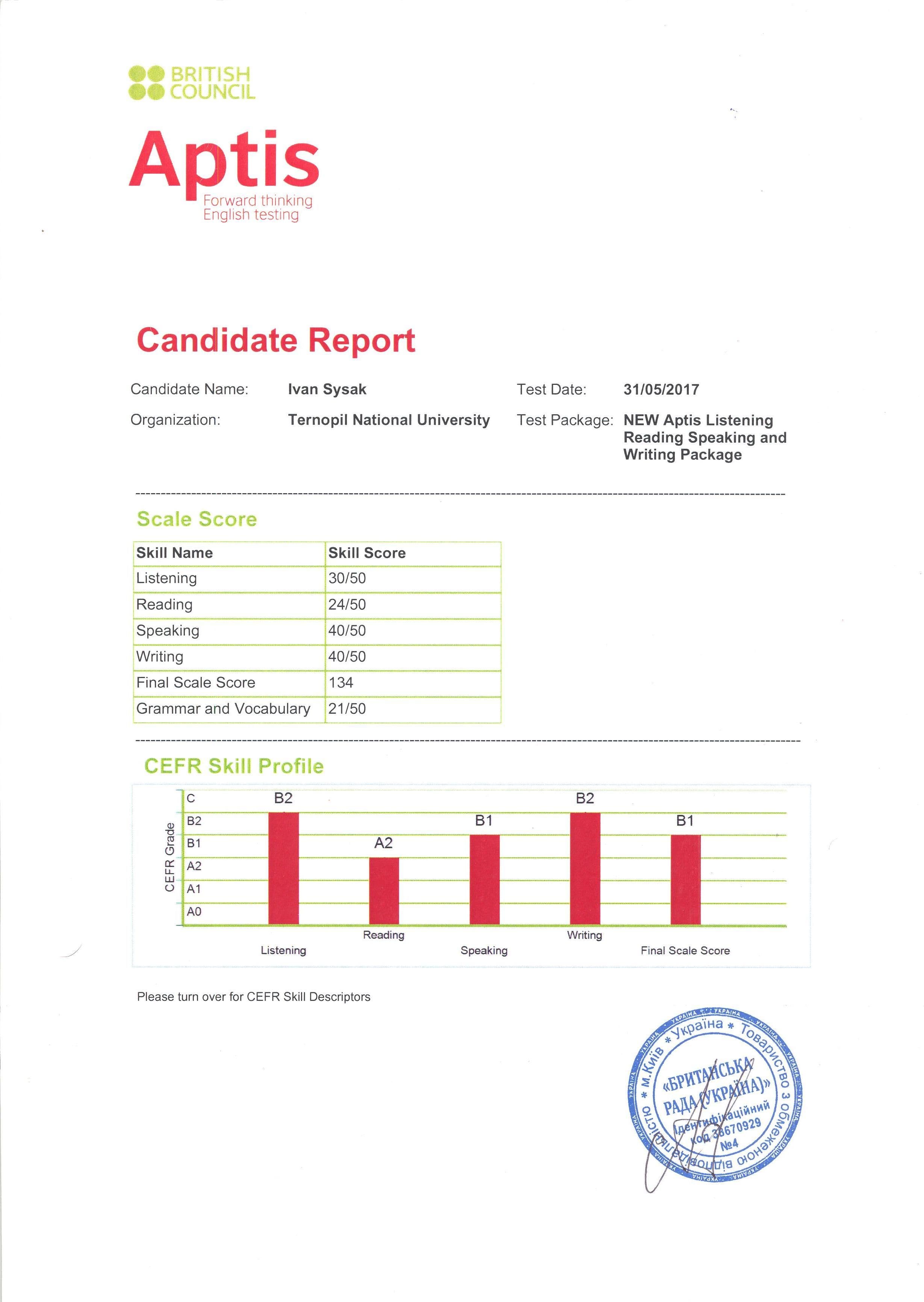 - "British Counsil. Aptis", B1, 31.05.2017.