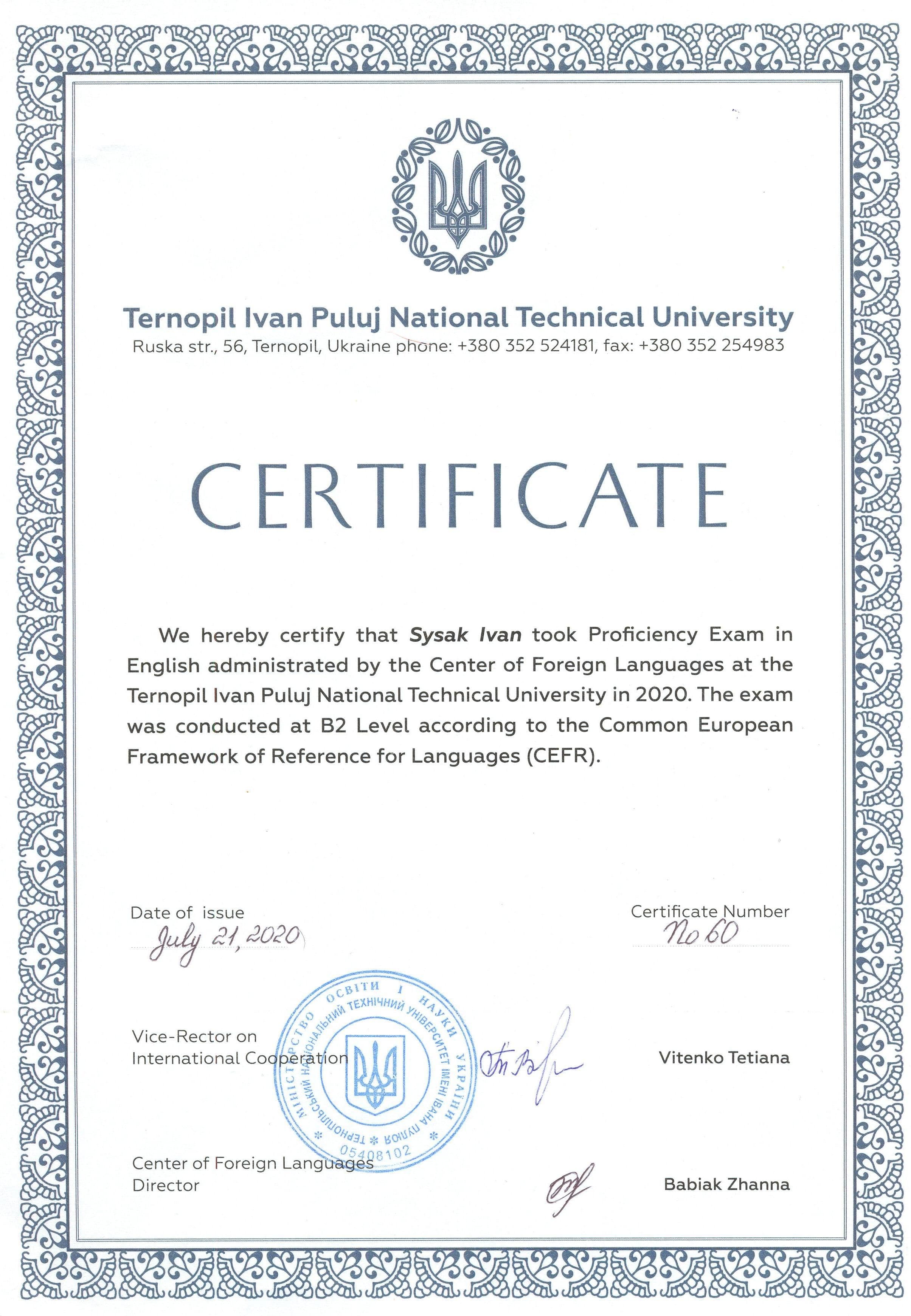 - «Common European Framework of Reference for Languages (CEFR)», рівень В2, 21.07.2020 р.