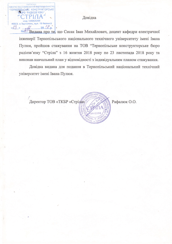 - Стажування у ТОВ “Тернопільське конструкторське бюро радіозв’язку “Стріла”, жовтень – листопад 2018 р.