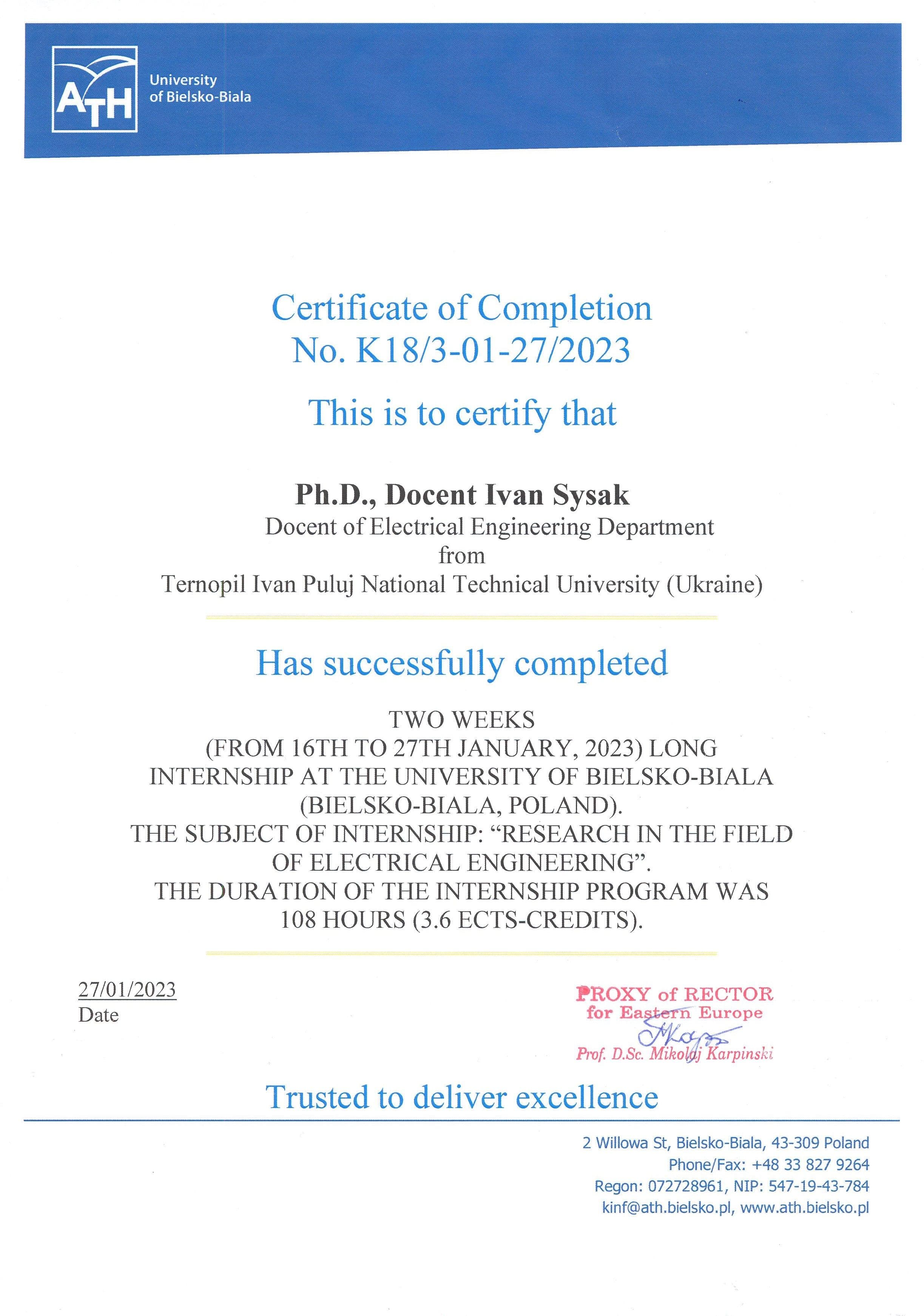 - Міжнародне стажування в університеті Бельсько-Бяла (Польща), січень 2023 р.