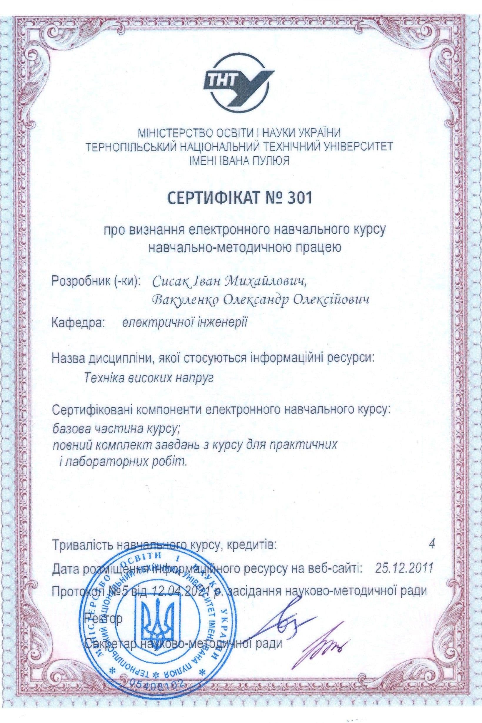 - Сертифікат № ДН 301 від 12.04.2021 р. про визнання інформаційних ресурсів навчально-методичною працею електронний навчальний курс «Техніка високих напруг», виданий ТНТУ імені Івана Пулюя