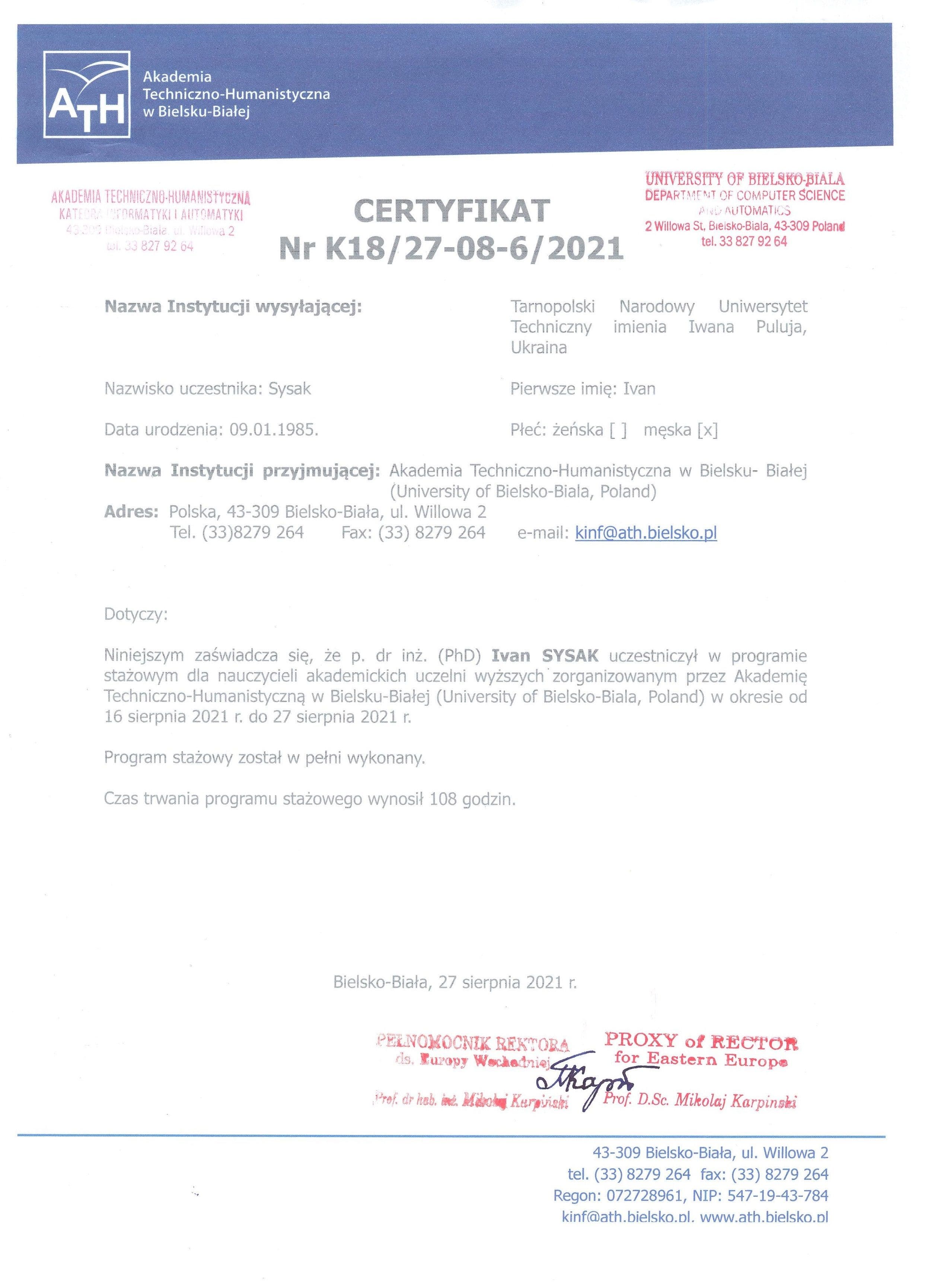 - Міжнародне стажування в університеті Бельсько-Бяла (Польща), серпень 2021 р.