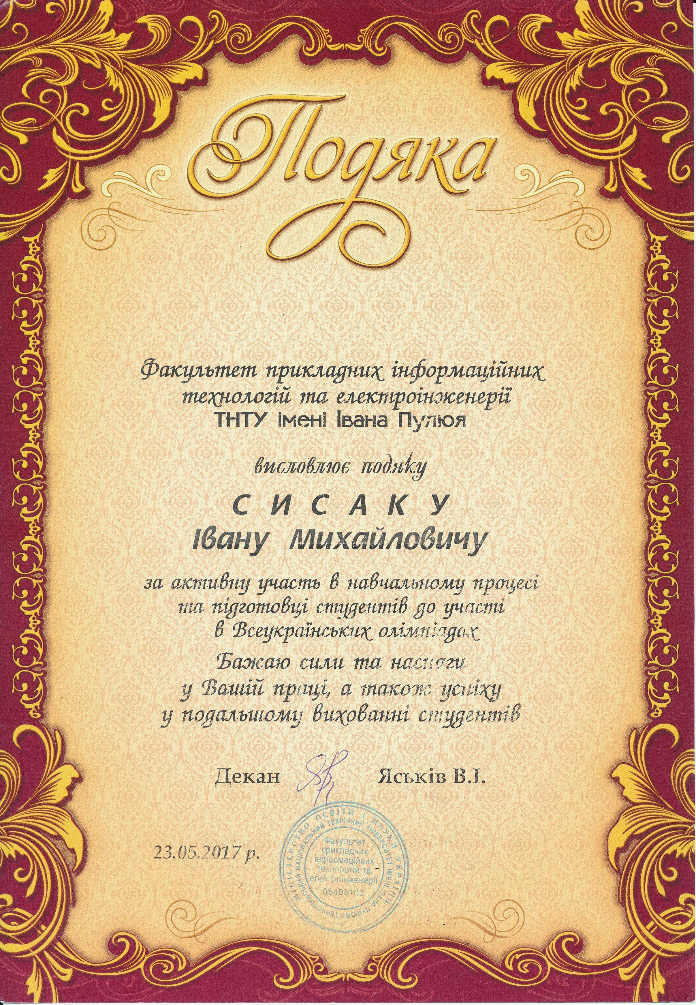 - Подяка від декана ФПТ за активну участь в навчальному процесі та підготовці студентів до участі в Всеукраїнських олімпіадах, 23.05.2017.