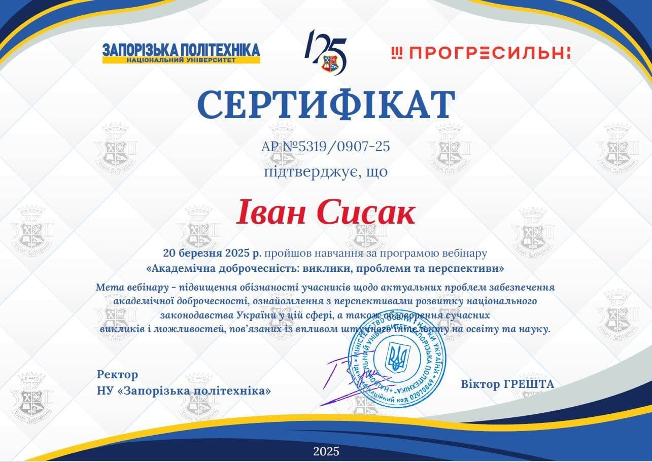 - Підвищення кваліфікації на базі НУ «Запорізька політехніка» за програмою вебінару «Академічна доброчесність: виклики, проблеми та перспективи» (сертифікат АР №5319/0907-25) 20 березня 2025 р. з обсягом навчального навантаження 15 год. (0,5 кредиту ЄКТС)